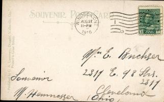 Notes: Postmarked 1916; Addressed to: Mr. E. Buchser, from M. Hemnesser; Canadian Bank of Commerce, designed by Albert Kahn and built in 1906 is on the left; the Pere Marquette Station is also on the left, towards the river, and the ferry landing is visible in the background; looking north. |