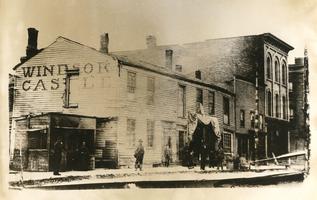Notes: c. 1860; "Windsor owes its name to a pioneer merchant, James Dougall. At a meeting in Hutton's Tavern in 1836 [or 1835], prominent citizens picked the name Windsor from suggestions, including Bellevue, Richmond and Babylon. The name caught on immediately and the owner of Hutton's Tavern liked it so well he renamed his hostelry Windsor Castle Hotel [in 1838]." (Windsor Star); this may not be true as S. T. Probett seems to have opened the Windsor Castle in 1838, before Mr. Hutton came to town (Essex County Historical Society Papers and Addresses, vol. 3); was located on the south side of Sandwich Street, three buildings east of Ferry Street; a sign for Kun Sing City Laundry is also visible; Donald Cameron's original dry goods store (later Bartlet, MacDonald and Gow department storeTurner) was the frame structure between the Windsor Castle Hotel and the taller brick building on the right. The little shack on the far left is Charles Turner's Fish Market. It burned down in 1876. |
