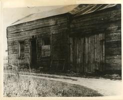 Notes: Photograph c. 1925?; log cabin from 1830s?, near Lake Erie, possibly on mainland in Mersea or Gosfield townships or perhaps on Pelee Island; on back: "Loyalist architecture, Lake Erie (Fox); logs, note end joints, squared logs, covered with planking" |