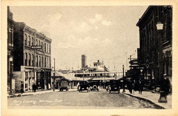 Notes: C. 1916; unused; Ferry Landing, taken from just north of Ferry Hill, the corner of Ouellette Avenue and Sandwich Street; on the right: there are signs for Gibson Brothers, Tobacconists and Gundy And Gundy, Real Estate; on the left: there are signs for F. F. Ingram Co., Perfumes, "Servself Lunch, never closed", and "Rooms" |