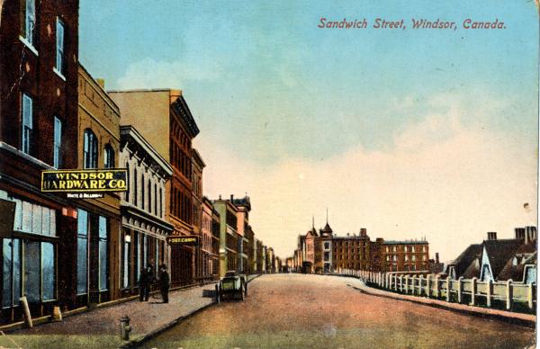 Notes: c. 1912; shows Sandwich Street (now Riverside Drive) looking west, from Windsor Avenue (no longer goes to Riverside Drive). On the left (south side): the Windsor Opera House is the tallest building in the background; a sign "Postcards" is visible, and also a sign for "Windsor Hardware Company: White & Billing"; on the right (north side) is: the Canadian National Railway Station (Sandwich Street and Goyeau Street); it was built in 1884 and closed in 1961; the British American Hotel can be seen in the background. |