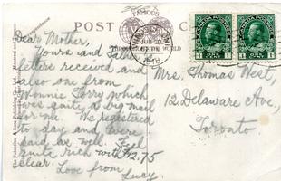 Notes: Postmarked 1918; addressed to Mrs. Thomas West; from Lucy West; looking east along Pitt Street; the post office was located on the southwest corner of Pitt Street and Ouellette Avenue; the post office was built in 1879 and demolished in 1932; the Boer War monument designed by Walter Allard is in front of the post office; the Royal Bank is on the southeast corner. |