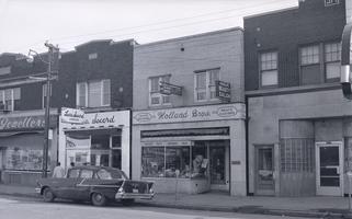 Notes: South side of Ottawa Street, just west of Hall Avenue; at 1275: Gisela's Beauty Salon, Sami L. Gibson, optometrist, and Edward G. Merner, dentist; at 1277: Holland Brothers, Grocers; at 1281: Joseph M. Schulde, surgeon; at 1285 Laura Secord Candies; at 1295: Anthony Horvath, Jeweller |