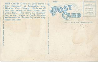 Notes: c. 1928; "Wild Canada Geese on Jack Miner's Bird Sanctuary at Kingsville, near Windsor, Ont., Canada. Birds are all wild and belong to Miss Canada and Uncle Sam. They know no boundary line as they winter in North Carolina and summer at Hudson Bay where they breed and nest." |