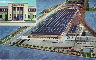 Notes: c. 1955; located at the Chrysler Centre, which is just south of Tecumseh Road East and is essentially a continuation of Drouillard Road; "You are invited to visit the Administration Building, the Passenger Car Plant, the Truck Plant and the Motor Plant of the Chrysler Corporation of Canada, Limited. The plants occupy more than 67 acres and are equipped with the most modern machinery and a total of more than five miles of conveyors for the precision manufacture of Chrysler, DeSoto, Dodge and Plymouth passenger cars, Dodge and Fargo trucks and Chrysler-built engines. You will see these great Canadian-built vehicles take shape before your eyes. It's a sight you will never forget." |
