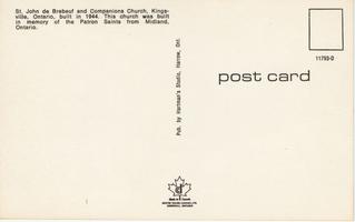 Notes: c. 1960; "St. John de Brebeuf and Companions Church, Kingsville, Ontario, built in 1944. This church was built in memory of the Patron Saints from Midland, Ontario."; located at 67 Main Street East. |