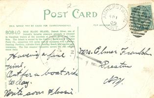 Notes: Postmarked 1909; " Bob-Lo: Bois Blanc Island, Detroit River, one of Detroit's favorite pleasure grounds is situated in Canadian waters at the junction of Detroit River and Lake Erie. The island is owned by the Detroit, Belle Isle & Windsor Ferry Co., comprises 225 acres and is equipped with a casino, dancing pavilion, athletic field, bathing beach and similar conveniences. The fine steamer Columbia covers the run several times daily."; addressed to Mrs. Elmer Franklin |