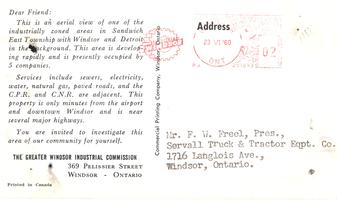Notes: Postmarked 1960; "This is an aerial view of one of the industrially zoned areas in Sandwich East Township with Windsor and Detroit in the background. This area is developing rapidly and is presently occupied by 5 companies. Services include sewers, electricity, water, natural gas, paved roads, and the C.P.R. and C.N.R. are adjacent. This property is only minutes from the airport and downtown Windsor and is near several major highways." The postcard was used by the Greater Windsor Industrial Commission to encourage interest in the area. This particular postcard was sent to F. W. Freel, the president of the Servall Truck And Tractor Equipment Company in Windsor. In the background, looking north, the Ford Test Track can be seen. Running north-south to the west of the track is Drouillard Road, and to the east, Central Avenue. Tecumseh Road East runs east-west in the background, then Somme Avenue. Grand Marais Road East cuts the bottom-right corner. |