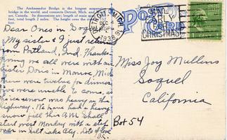 Notes: Postmarked 1938; "The Ambassador Bridge is the longest suspension bridge in the world, and connects Detroit, Mich. and Windsor, Canada. It's dimensions are: length of main span 1,850 feet, total length, 2 miles. The height over the river is 152 feet." Postcard is addressed to Miss Joy Mullins. |