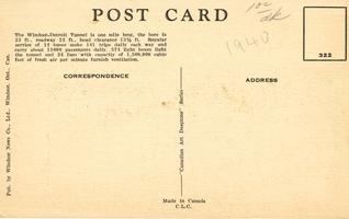Notes: c. 1940; "The Windsor-Detroit Tunnel is one mile long, the bore is 33 ft., roadway 22 ft., head clearance 13 1/2 ft. Regular service of 14 buses make 141 trips daily each way and carry about 11 000 passengers daily. 574 light boxes light the tunnel and 24 fans with capacity of 1,500,000 cubic feet of fresh air per minute furnish ventilation."; centre background: Prince Edward Hotel; centre left: Norton Palmer Hotel. |
