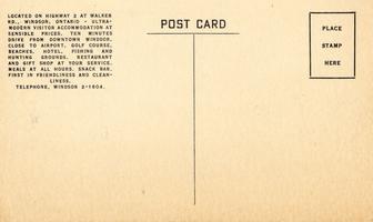 Notes: c. 1935; "Located on Highway 2 at Walker Rd., Windsor, Ontario - Ultra-modern visitor accommodation at sensible prices. Ten minutes drive from downtown Windsor. Close to airport, golf courses, beaches, hotel, fishing and hunting grounds. Restaurant and gift shop at your service. Meals at all hours . Snack Bar. First in friendliness and cleanliness. Telephone, Windsor 2-1604." Routley's Motor Court was located at 3989 Walker Road; by 1967 it had closed. |