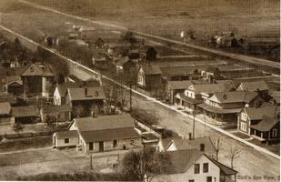 Notes: Reproduction; view from St. Anne's Church Steeple, 1920. From the private postcard of Jos. B. Renaud. Looking west on Tecumseh Rd: 1. Paris Hotel, owned by the Laramies. Original structure was demolished and new building was erected on immediate area; now Pat & Hanks Fish 'n Chips. 2. Post office, (run by Joe Labute) now Vimich Traffic Logistics. 3. Parent Bros. General Store. Burnt in 1928 and was rebuilt. Reopened by the Parent Bros. as the Canadian Hotel, presently Kingers. 4. Pratt's Hardware, later sold to E.J. Drouillard and continued as hardware; now Advance Rejuvenation Spa. 5. Home of Maurice Renaud (brother of J.B. Renaud), later residence of Sen. Dr. Gustave Lacasse. The home continues to be occupied by the family of his son Hector, former mayor of Tecumseh. 6. A hotel, since demolished, now site of Legends Diner, parking lot and Riverside Rentals (from back of postcard, issued 2001). |