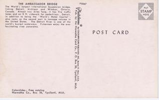Notes: C. 1955; "The World's longest international suspension bridge, linking Detroit, Michigan and Windsor, Ontario, Canada. Almost two miles long, it has five traffic lanes and an 8 ft. sidewalk for pedestrians. Detroit, in addition to being the World's Motor Capital, also ranks as the second port in tonnage volume in the United States. The Detroit River is one of the world's busiest waterways. Fishermen enjoy the ever fascinating river panorama." (from back of postcard) |