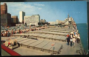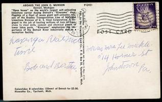 Notes: Postmarked 1957; "Open house on the world's largest self-unloading limestone carrier during Detroit's Riverama days. Flagship of a fleet of seven giant self-unloader vessels of the Bradley Transportation Line of Michigan Limestone Division of U. S. Steel Corporation. Is engaged in the job of hauling millions of tons of limestone to steel mills, cement and chemical plants of lower lakes ports. Riverama emphasizes the importance of the Detroit River industrially and as a recreation facility."; addressed to Mr. and Mrs. Lee Mickle. |