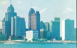 Notes: c. 1960; buildings in the Detroit skyline; on the left is the Greater Penobscot Building, located at 645 Griswald Street; designed by Wirt C. Rowland and completed in 1928, it is 47 stories high, and for almost 50 years it was the tallest building in Detroit; in front of it is the Buhl Building, designed by Wirt C. Rowland and completed in 1925; it is 26 stories high and is located at the corner of Congress St. West and Griswold St.; the brown building to the right is the Guardian Building; also designed by Wirt C. Rowland and located at 500 Griswold street, it was built 1928-9; the main building is 36 stories high and one of the two spires rises another 4 stories; the white building on the far right is the Coleman A. Young Municipal Building, located at 2 Woodward Avenue; it was built by the firm Harley, Ellington and Day from 1951-1954 and is 20 stories high; to the left of it, the top of the Cadillac Building can be seen; located at 65 Cadillac Square, the 40 storey building was built by the firm Bonna and Chaffee in 1927 and was originally called Barlum Tower.