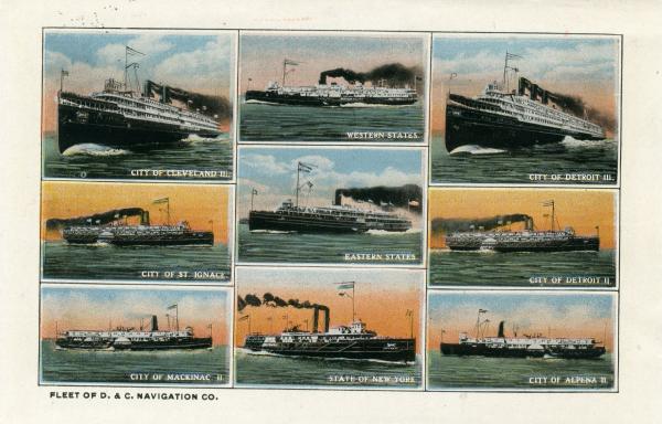 Notes: c. 1918; postmarked 1920; "Detroit and Cleveland Navigation Company operate the largest and finest fleet of side wheel steamers in the world, from Detroit to Buffalo, Cleveland, Toledo, Mackinac Island and way ports. General Offices no. 10 Wayne Street, Detroit, Michigan. Philip H. McMillan, President, A. A. Schantz, Vice President, and General Manager, L. G. Lewis, General Passenger Agent" |