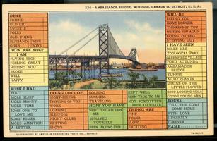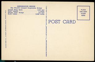 Notes: c. 1935; "Ambassador Bridge: the World's longest suspension bridge; Length of Main Span: 1,850 feet; Total Length: 2 miles; Height over Bridge [River?]: 152 feet; Each Cable: 8,066 wires"; humourous/joke postcard |