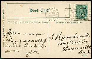 Notes: Postmarked 1911; Whaleback cargo steamships were designed by Captain Alexander McDougall; 44 Whalebacks were built between 1887 and 1898 and most were used in the Great Lakes for transporting grain and ore; addressed to J. Wambrook. This ship is the James. B. Colgate. It was built in 1892 and sank off the shores of Long Point, Ontario in Lake Erie on October 20th, 1916. |