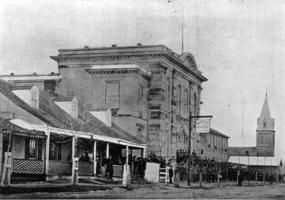 Notes: c. 1866; "Published by the kindness of Thomas A. McKee"; photo taken by a Mr. Henry; shows the Western Hotel, the new Jail and Court House, the old brick jail and court house, the Registry Office, and St. John's Church (on the east side of Bedford Street); the Western Hotel building was built in 1810 as a residence for James Wood. In 1841, it was already known as the Western Hotel and was owned by a Mrs. Hawkins. It was bought in 1852 by Cyrus Dobson and was sometimes called the Dobson House. Judges used it as a quasi-headquarters. In the late 1860s, it was purchased by James Alexander Stuart and became the Stuart Hotel. He demolished this building and built a new one in 1875. In 1876, he moved into the hotel and lived there until his death in 1894. In 1909, the hotel was owned by Ignace Langlois and was known as the Vendome Hotel. It operated as a hotel well into the 1920s and in 1931 was being leased by the County of Essex for use as legal offices. |