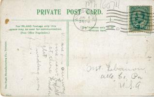 Notes: c. 1907; note that the Dominion Bank (S.W. corner of Sandwich Street and Ouellette Avenue, which opened in 1909, has not yet been built. It was built on the site of the second International Hotel (red brick building). On the left, the store, Bartlet, MacDonald And Gow, is visible. The Merchants Bank of Canada is on the northwest corner of Ouellette Avenue and Sandwich Street; the Canadian Bank of Commerce is on the southeast corner. The British-American Hotel is on the northeast corner. It was built after the fire of 1871. It was basically built as an extension of an older hotel: Hirons House. It was demolished in 1975. This card is postmarked 1911(?); the stamp is of King Edward VII who died in 1910; addressed to: Miss Janet Dalgliesh? |