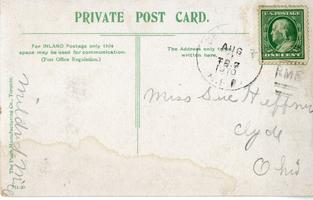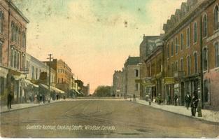 Notes: Postmarked 1910; looking south from the intersection with Sandwich Street (Riverside Drive); the photograph dates to before 1909 (when the Dominion Bank was built on the southwest corner of Ouellette Avenue and Sandwich Street); in the right foreground is the International Hotel (9 Ouellette Avenue; Edwin Wigle, proprietor), then Howell Bros & Knowlton, Jewellers, Laing's Drug Store, then Pitt Street, the Post Office, and across Chatham Street in the background is the Victoria Block; in the left foreground, is the Canadian Bank of Commerce, and then across Pitt Street is the Manning Block; addressed to Miss Sue Heffner. |