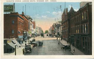 Subject(s): Ouellette Avenue (Windsor) Sandwich Street (Windsor) Medbury Lane (Windsor) Ferry Hill (Windsor) Commercial Buildings Stores Automobiles Duck, John M., Broker (Windsor) Gundy And Gundy, Real Estate (Windsor) Gibson Brothers, Tobacconists (Windsor) Lanspeary's Drug Store (Windsor) Dominion Bank (Windsor) Merchants Bank Of Canada (Windsor) Banks Prohibition |