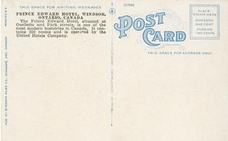 Notes: c.1925; "The Prince Edward Hotel, situated at Ouellette and Park streets, is one of the most modern hostelries in Canada. It contains 250 rooms and is operated by the United Hotels Company."; was designed by the Buffalo architects, Esenwein And Johnson, with Albert McPhail, as associate architect. It opened in 1922, closed in 1967, and was demolished in 1976; was located on the northeast corner of Ouellette Avenue and Park Street. |