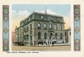 Notes: The souvenir folder is postmarked 1924; this is one of the sixteen views it contains; the post office was located on the southwest corner of Ouellette Avenue and Pitt Street; it was built in 1879 and demolished in 1932; the architect was William Scott And Co.; it replaced several earlier post offices that were near the northeast corner of Ouellette Avenue and Pitt Street; the Boer War Monument, designed by Walter Allard, is located at the front entrance. It was dedicated on May 24th, 1906, and later moved to Jackson Park. |