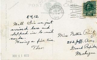 Notes: Postmarked 1912; Addressed to Miss Nettie Ponitz; the Library was located on the southeast corner of Victoria Avenue and Park Street |