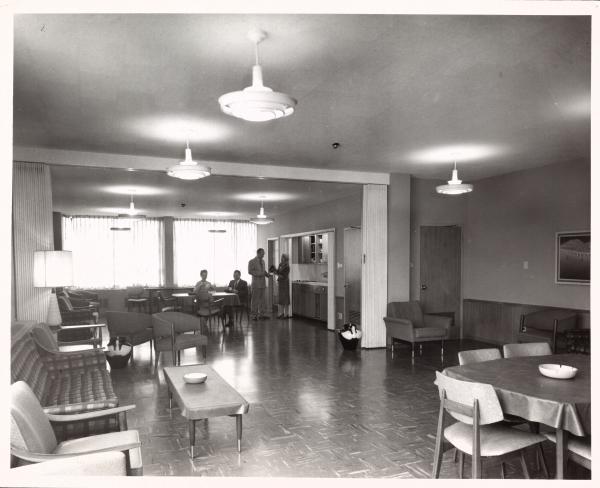 Notes: ca. 1959; the library staff lounge was on the third floor, south end. It is currently room 303. It had a washroom and a small kitchen. It was essentially one large room with the faculty lounge (room 302), but could be divided with folding doors; photographer: Wild Studios, 985 Ottawa St., Windsor, Ont. |