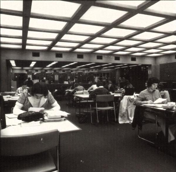 Notes: ca. 1972; photo from contact sheet; the reserve reading room was on the ground floor (basement), north side, of Leddy Library; looking east. |
