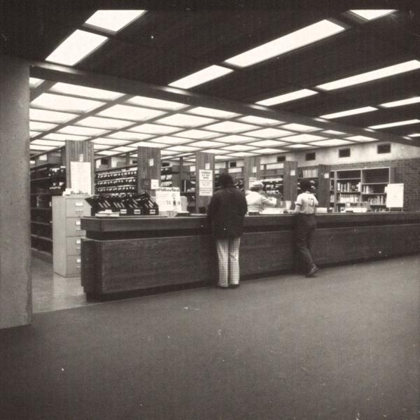 Notes: ca. 1972; photo from contact sheet; looking east; the reserve reading room was located on the north side of the ground (basement) floor of the main building of Leddy Library. |